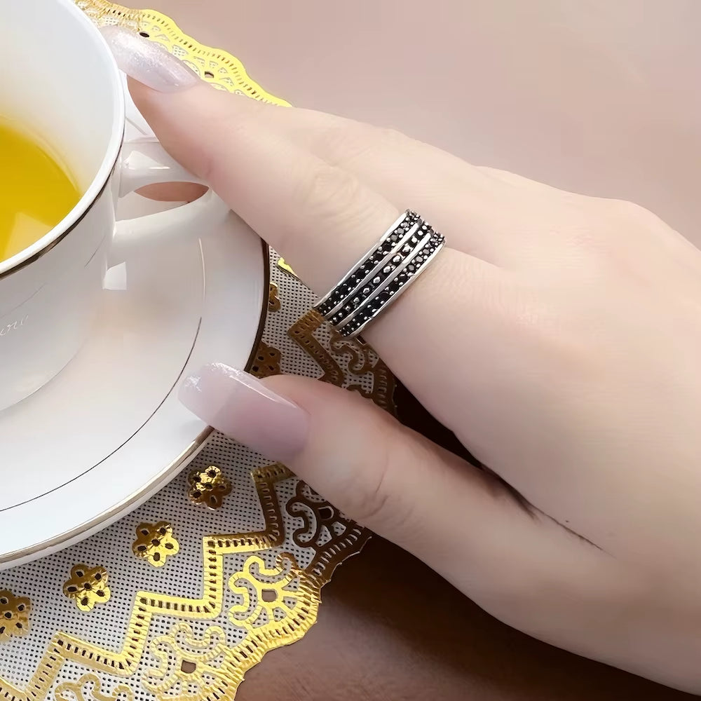 Sleek, dark, and effortlessly cool. The Black CZ Pave Band Ring is a vintage-inspired classic crafted in pure 925 sterling silver, featuring a smooth band encrusted with deep black cubic zirconia stones in a seamless pave setting. It's understated luxury that makes a bold statement.
