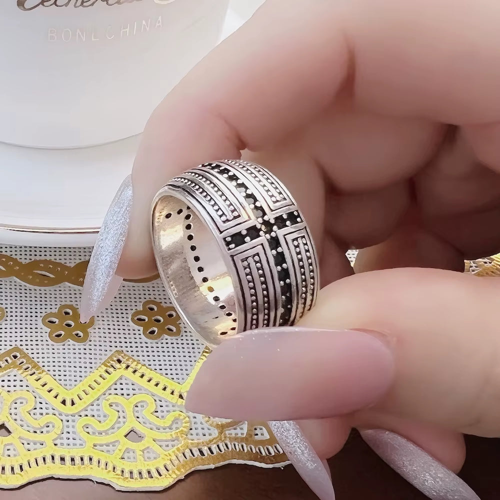 Faith meets edge. The Black CZ Cross Ring is a bold, meaningful piece crafted in pure 925 sterling silver, featuring a striking cross design set with deep black cubic zirconia stones. It's a ring that carries weight — both in symbolism and in style — making it a powerful statement for any evening look.