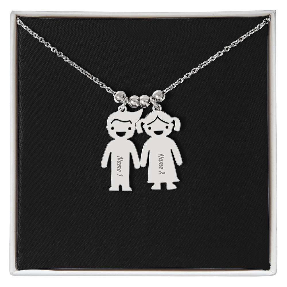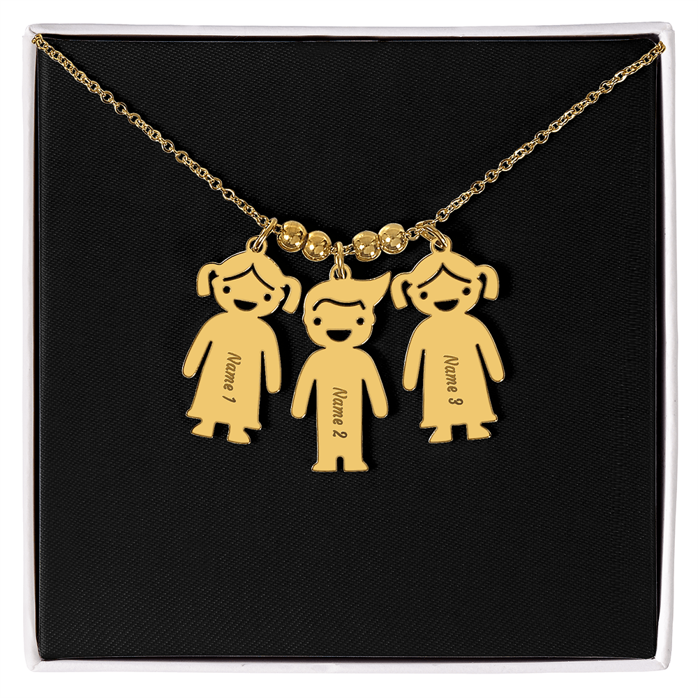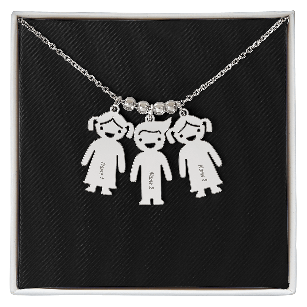This unforgettable gift will leave her speechless! Introducing the Engraved Kids Charm Necklace. This necklace features up to three engraved charms, each shaped like a child, and can be personalized with the name or word of your choice. Made with high-quality materials, this necklace is a perfect gift for mothers and grandmothers who want to keep their children or grandchildren close to their heart. Whether you want to commemorate a special moment, celebrate a milestone, or simply express your love, this necklace is a perfect way to do it.