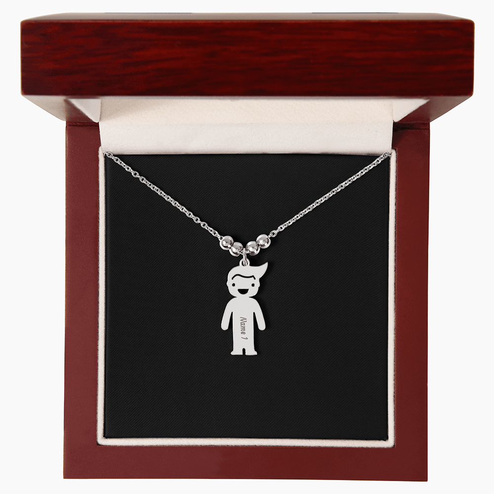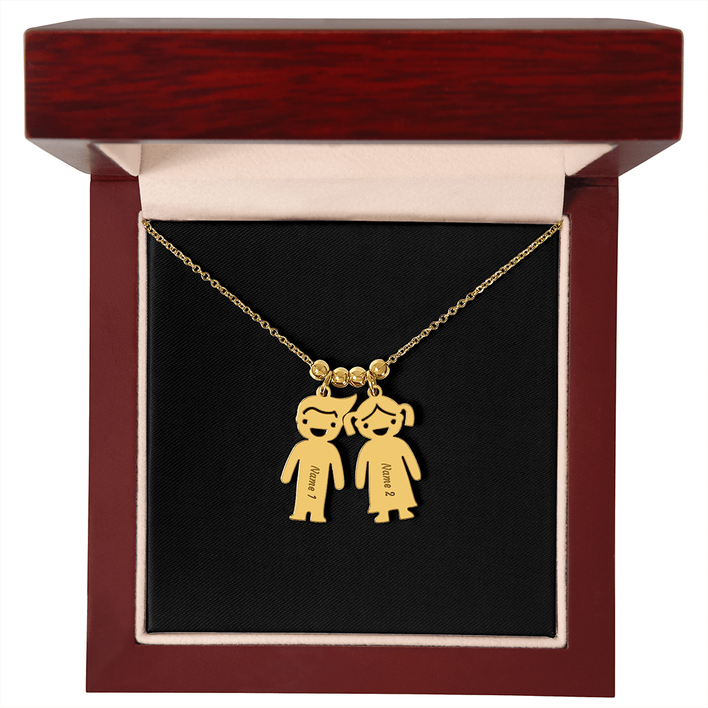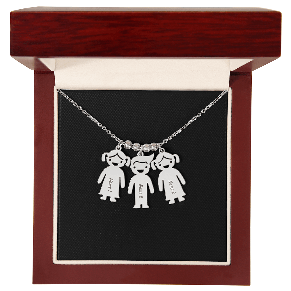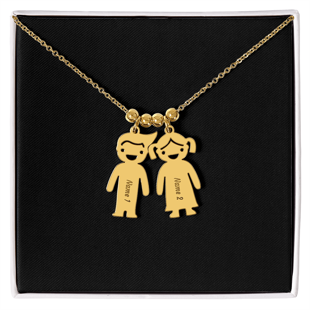 This unforgettable gift will leave her speechless! Introducing the Engraved Kids Charm Necklace. This necklace features up to three engraved charms, each shaped like a child, and can be personalized with the name or word of your choice. Made with high-quality materials, this necklace is a perfect gift for mothers and grandmothers who want to keep their children or grandchildren close to their heart. Whether you want to commemorate a special moment, celebrate a milestone, or simply express your love, this necklace is a perfect way to do it.